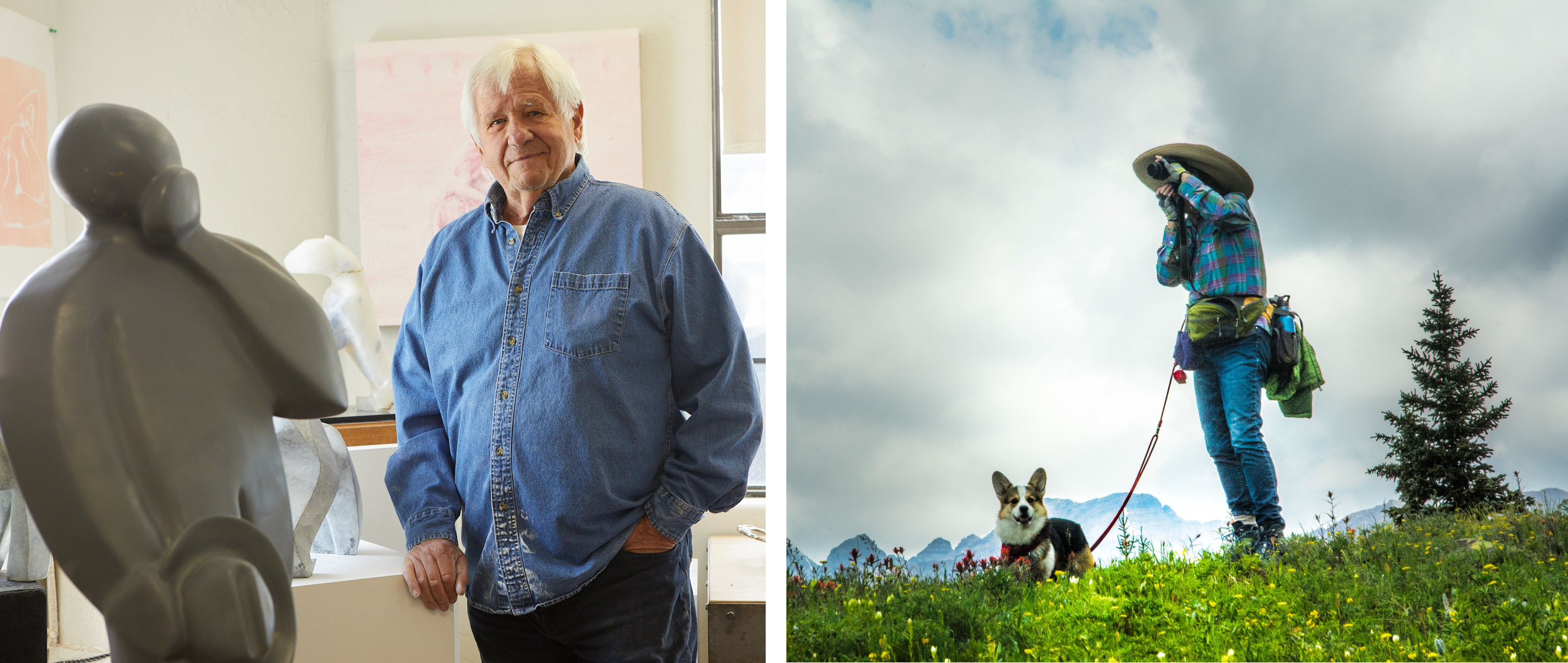 Image of sculptor Mark Yale Harris with a stylized sculpture of a man with his hat in hand and an image of painter Kathleen Frank with her corgi, hiking and photographing in nature