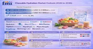 DELAWARE, NY, UNITED STATES, February 24, 2026 /EINPresswire.com/ -- The global hydration landscape is undergoing a structural transformation as consumers and industrial sectors pivot away from liquid-based sports drinks toward portable, solid-format electrolytes. According to the latest market outlook by Future Market Insights (FMI), the global Chewable Hydration Market valued at USD 5.5 billion in 2026—is projected to reach USD 10.1 billion by 2036, expanding at a steady CAGR of 6.3%.